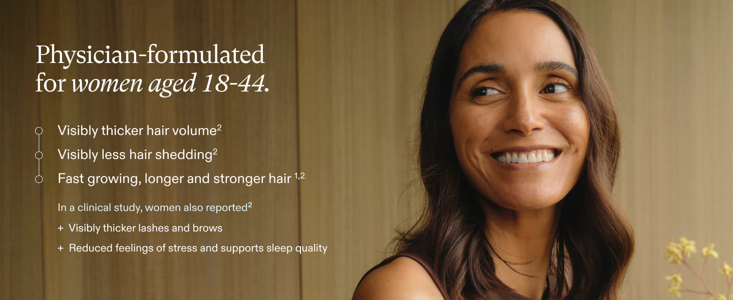 Daily hair wellness for perimenopause, menopause, and beyond. A clean, dermatologist-recommended formula supporting visible thickness, scalp coverage, and stronger-feeling strands.